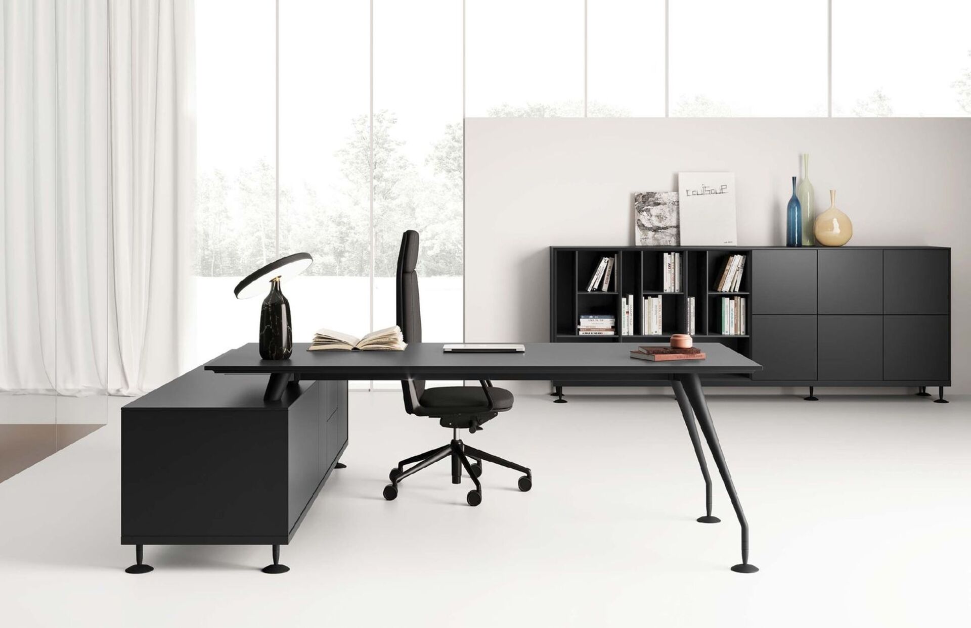 Стол руководителя – столешница 60 мм, опоры 41 мм, система push-to-open для ящиков.