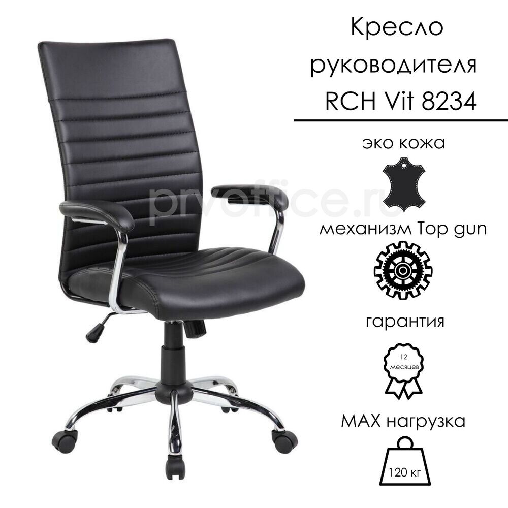 Кресло руководителя RCH Vit 8234 - это искусство комфорта и стиля, созданное специально для личностей, которые всегда в ресурсе и в движении. Лаконичный дизайн, обивка из черной эко-кожи - именно в этом кресле нет ничего лишнего. Вы с легкостью сможете настроить данное кресло под ваши индивидуальные предпочтения с помощью встроенного газлифта и механизма качания. Опоры с антивандальный покрытием для защиты вашего напольного покрытия. Предельная нагрузка - 120 кг