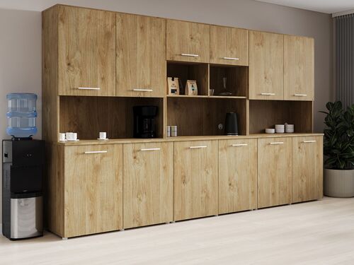Внешне офисная кухня – это комплект компактной мебели, которая сочетает эргономичность и функциональность. Мебельный набор решает ряд задач: