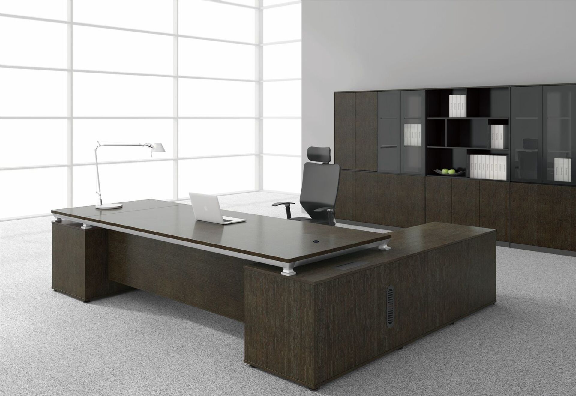 Для изготовления офисной мебели Easy из нашего каталога используется высококачественная ДСП и роскошный древесный шпон в качестве покрытия, а кромка оформлена вставками из массива дерева. Ощущение воздушности создает особое металлическое подстолье, за счет которого столешница будто бы парит, смотрится легкой, несмотря на значительную толщину. Прочность материалов, фурнитуры не вызывает сомнений, поэтому мебель для кабинета директора Easy является гарантированно устойчивой к износу и служит без нареканий десятки лет.