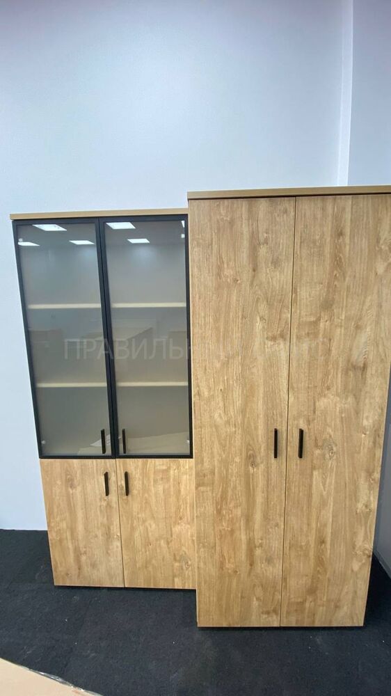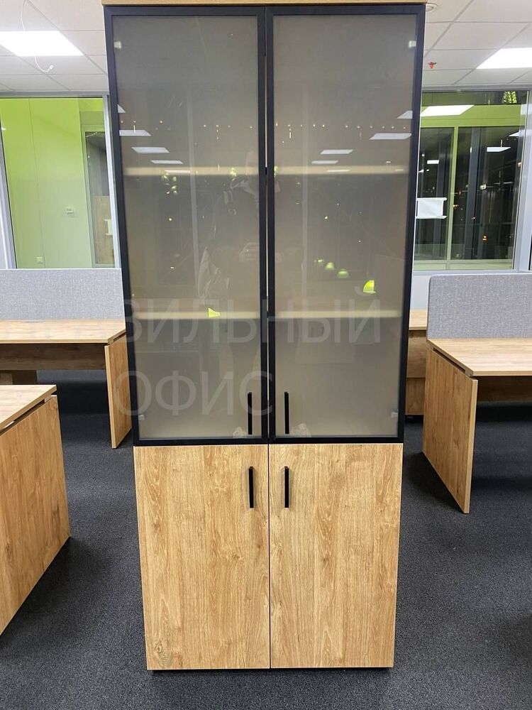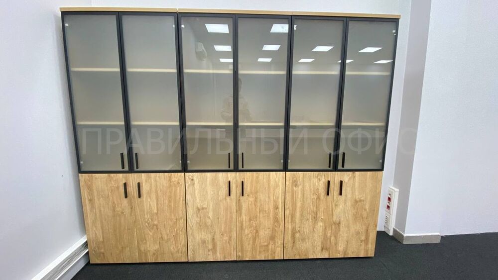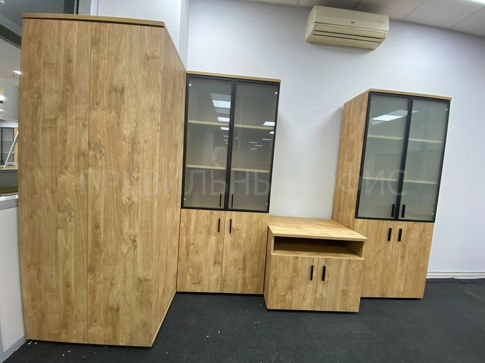 Одно из основных изменений — замена стандартного металлического профиля в рамах стеклянных дверей у шкафов для документов на профиль из темного металла. Это решение добавило современный и стильный элемент в оформление рабочего пространства. Кроме того, полностью была заменена лицевая фурнитура на всех фасадах, что также способствовало достижению уникального визуального эффекта.