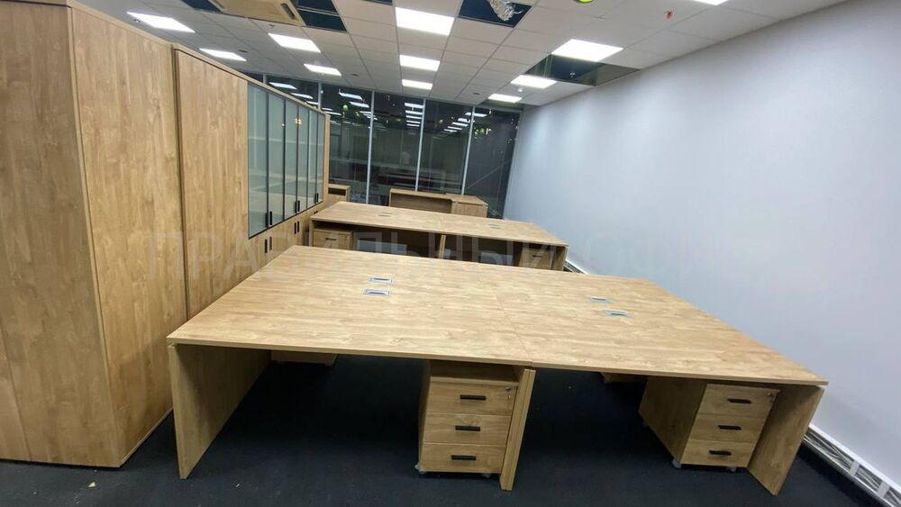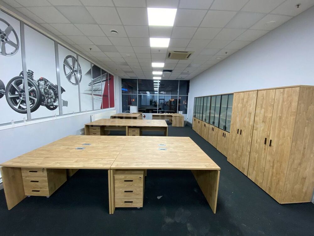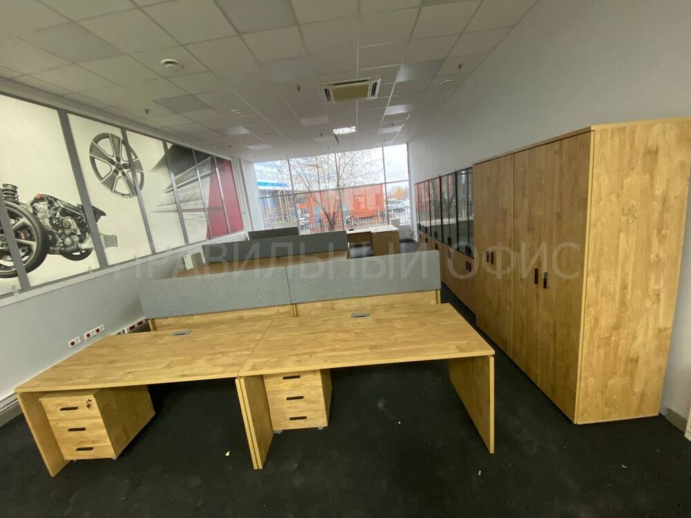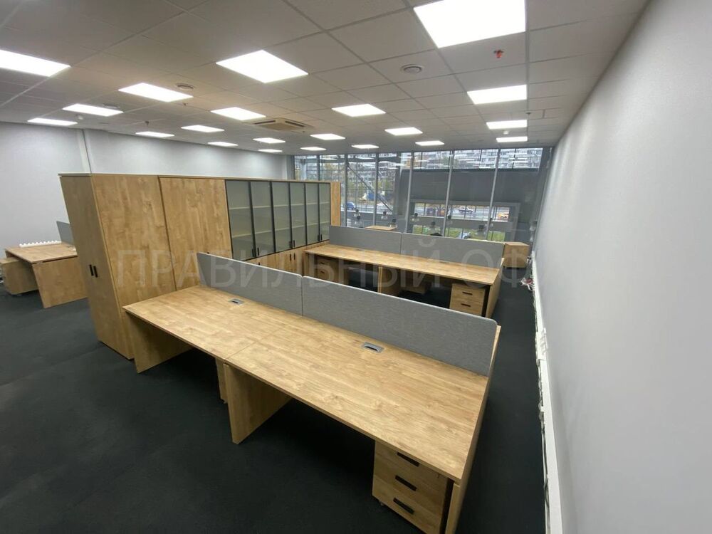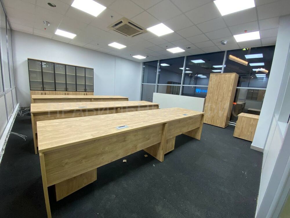В конечном итоге проект включает в себя 58 столов на опорах ЛДСП, 58 мобильных тумбочек с центральным замком для хранения личных вещей сотрудников, 29 шкафов со стеклом для организации документации, 11 гардеробов для одежды, 6 тумбочек под оргтехнику и 6 брифингов, что позволяет осуществлять оперативное взаимодействие и обсуждение рабочих вопросов.